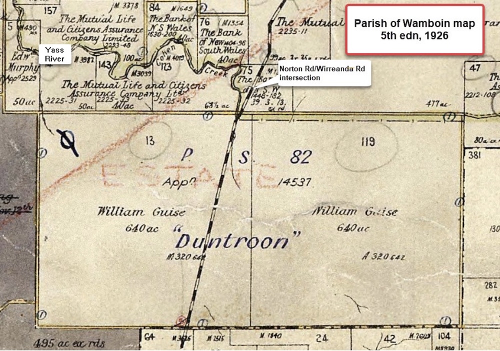 Six editions of the parish of Wamboin map were published, covering the period 1881 to 1967. One of them, the 5th edition, 1926, has an interesting handwritten annotation: ‘Duntroon’. (The only copy of the map that I found with this annotation is that on the NSW Land Registry Service’s Historical Land Records Viewer. It is not on the National Library of Australia’s copy. The State Library of NSW does not have a copy of the map.) Here is an excerpt from the map in question.